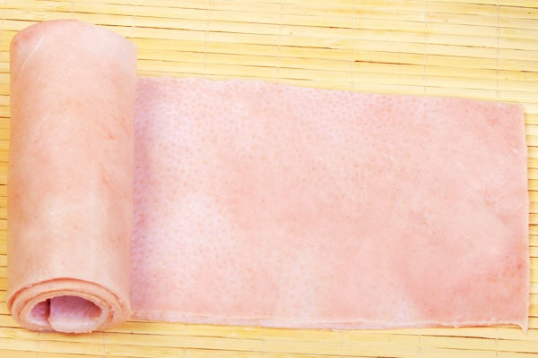 產(chǎn)品特點:位于豬脊背的一塊質(zhì)量最好的豬皮,可制作豬皮凍,也可油炸、燉、炒。